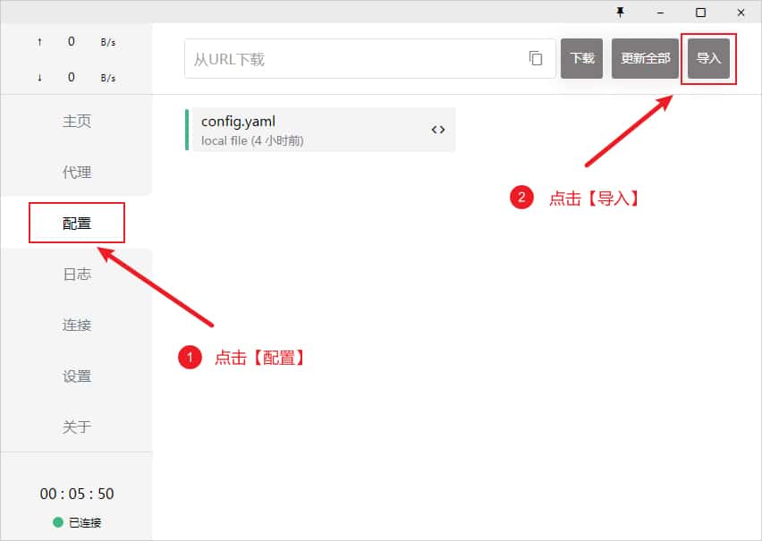 本地配置文件即通过本地文件拖拽导入,一般为无法通过远程订阅地址导入的情况下使用,可尝试在浏览器中下载配置文件后直接通过拖拽方式导入或点击 Import