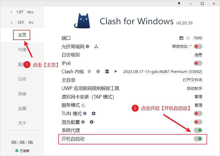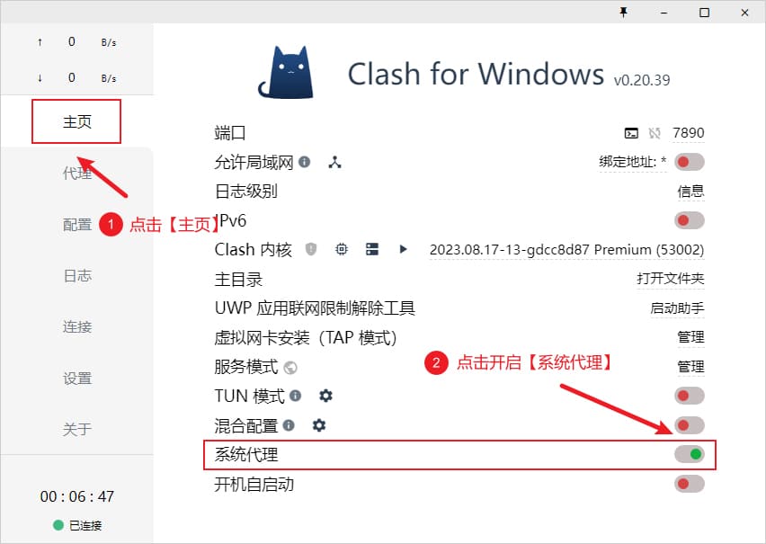 启用代理,需要点击界面左侧菜单 主页