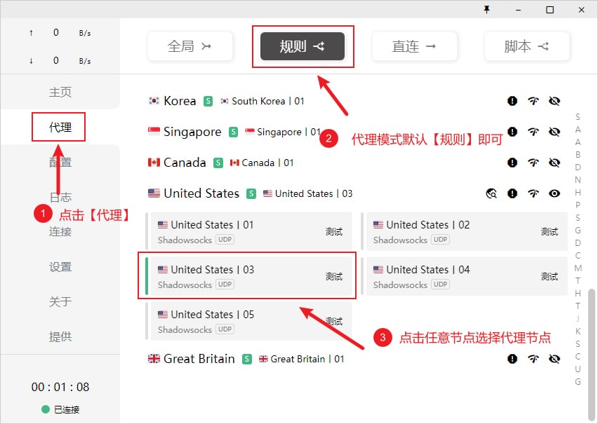 :选择代理方式(Global - 全局、Rule - 规则、Direct - 直连)及策略组节点选择; -